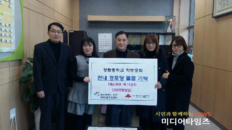 [미디어타임즈=문상수 기자] 청람중학교 학부모회(회장 강현미)는 지난 2일 청라2동주민센터(동장 윤효영)를 방문하여 100만원 상당의 경로당 후원물품 전달식을 가졌다. 이번 후원물품은 청람중학교 학부모회 주관으로 이루어진 바자회 수익금으로 마련 되었으며, 어르신들의 건강한 겨울나기를 위해 쌀, 떡 등을 관내 11개 경로당에 전달하였다.