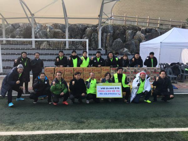 남양주유나이티드 축구회 회원들은 지난 21일 화도 월산리 푸른물센터 축구장에서 쌀 50포와 라면 50박스를 동부희망케어센터에 전달했다.
