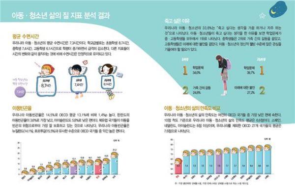 “아동·청소년 삶의 질 지표 분석 결과”에서는 아동·청소년의 삶의 질 지표 9개 영역 가운데 건강, 물질적 수준 및 환경, 학습·발달·역량, 여가·활동 등 7개 주요 영역의 세부지표를 심층 분석했다.