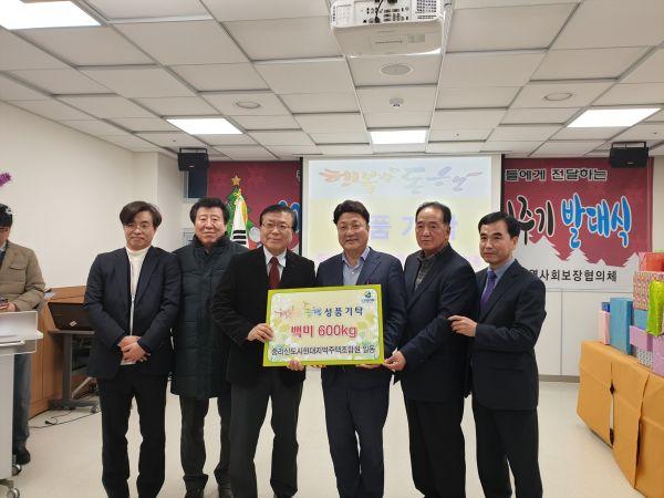 지난 19일 중리동행정복지센터 개청식과 함께 연말을 맞이해 2019년 행복나눔 소원들어주기 발대식 식전행사로 중리신도시현대지역주택조합에서 어려운 이웃들에게 전달해 달며 온정의 백미 600Kg을 기탁했다.