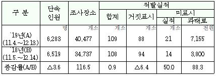 농관원 특별사법경찰 등 단속인력 연인원 6283명을 동원해 지난 11월 4일부터 12월 13일까지 김치 및 고춧가루 제조업체, 중국산 배추김치 취급업체, 통신판매업체, 일반음식점 등 4만477개소에 대해 원산지 표시 점검을 실시했다.