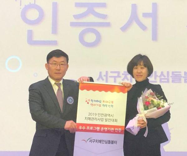 인천 서구는 지난 20일 인천시와 인천시 광역치매센터 주최로 개최된 ‘2019년 인천광역시 치매관리사업 발전대회’에서 “서구치매안심돌봄터”가 5년 연속 치매환자 돌봄 특화프로그램 우수 운영기관으로 선정돼 인증패를 수상했다고 밝혔다.