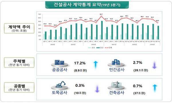 올해 3분기 건설공사 계약액이 전년 동기 대비 0.5% 증가한 46조 9천억원을 기록했다.