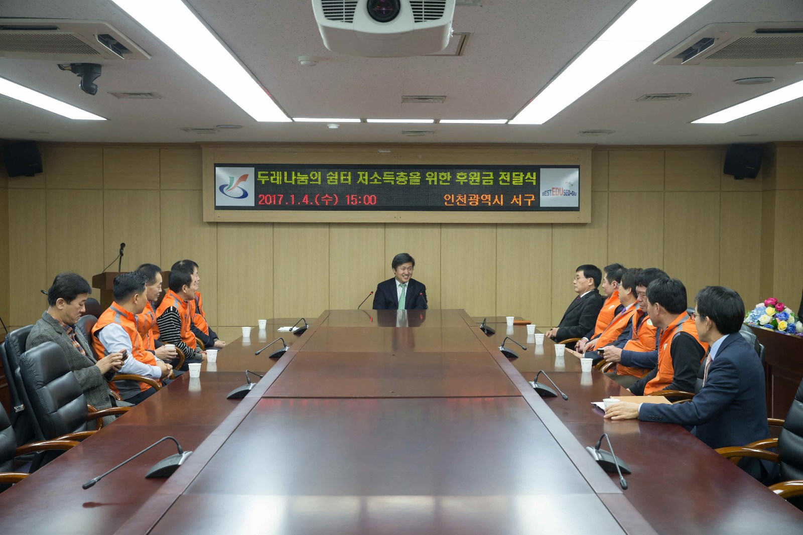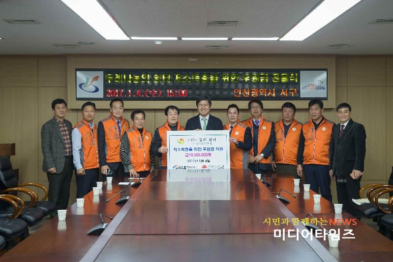 [미디어타임즈=문상수 기자] 지난 4일 두레나눔의 쉼터(회장 이윤근)는 인천 서구청(청장 강범석)을 방문하여 서구 관내 저소득층을 위한 후원금으로 1,050만원을 기탁했다. 석남동에 소재한 두레나눔의 쉼터는 2013년 4월에 설립한 비영리단체로 어려운 이웃을 돕는 기부문화를 실천하고 있으며, 불우청소년을 위한 장학금 지원, 어버이날 경로잔치 등 평소 주위의 어려운 이웃들을 위해 사회공헌활동을 진행해 왔다.이번 성금은 사골육수 판매 수익금으로 마련된 것으로 기존에는 석남동 위주로 활동하였으나 이번에는 서구 전체 21개동에 50만원씩 배분하여 저소득 청소년이나 독거노인 등 105명에게 전달될 예정이며, 또한 석남1동에 추가로 후원금 500만원을 기탁할 예정이라고 밝혔다.전달식에 참석한 강범석 서구청장은 “어려운 경제 환경속에서도 작은 정성을 모아 나눔을 실천하고자 하는 회원분들께 감사드리며, 앞으로도 지역사회 나눔 문화 확산을 위해 앞장서 주시기 바란다.”고 전했다