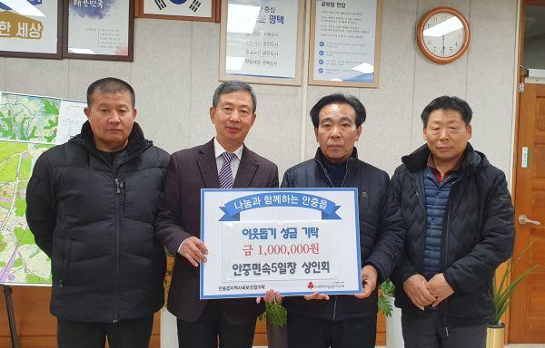 평택시 안중민속5일장 상인회는 지난 26일 안중읍행정복지센터를 방문해 생계가 곤란한 이웃들에게 도움을 주고 싶다며 이웃돕기 성금 100만원을 기탁했다.