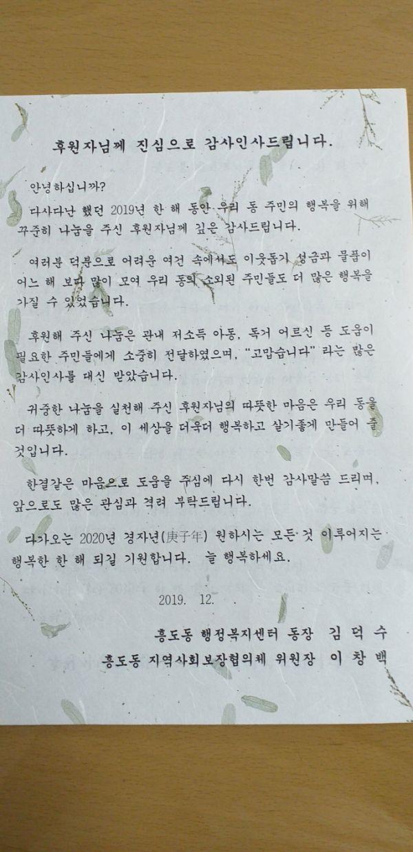 감사 서한에는 “어려운 여건 속에서도 이웃돕기 성금과 물품이 어느 해 보다 많이 모여 우리 동의 소외된 주민들이 더 많은 행복을 가질 수 있었으며 한결 같은 마음으로 도움을 주심에 감사드립니다”라는 내용을 담았다.