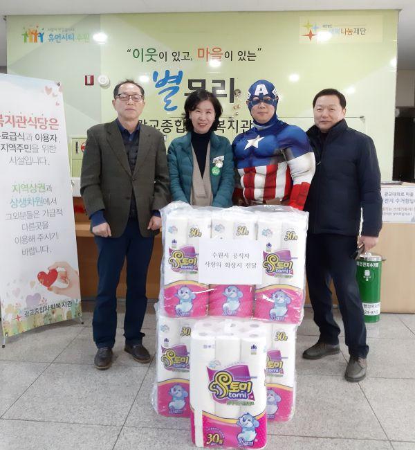 수원시가 27일 연무사회복지관, 광교종합사회복지관 등 관내 6개 종합사회복지기관을 방문해 ‘사랑의 화장지’ 2000여 롤을 전달했다.