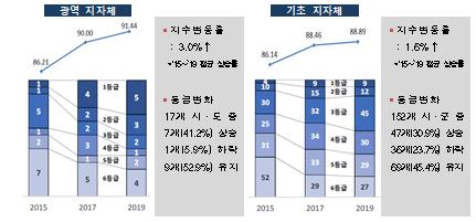 지역의 전반적인 관광 발전 수준이 점진적으로 향상 이번 결과를 2017년과 비교해보면 지역의 발전지수 평균은 광역지자체가 1.44%, 기초지자체가 0.43% 높아졌다.