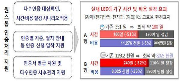 예를 들어, LED조명 제조기업이 LED등기구에 대해 5종의 인증을 받는 상황을 가정하고 5종의 인증을 순차적으로 받는 경우의 기존 시간·비용과 비교하면, 시간절감형 시나리오를 적용할 경우, 최대 약 170여 일 단축 및 약 70여 만원의 절감 효과가 있으며 비용절감형 시나리오의 경우 최대 약 390여 만원 절감, 약 110여 일을 단축할 수 있을 것으로 예상된다.