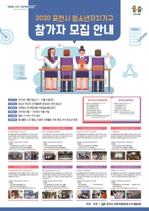 포천시가 오는 31일까지 ‘2020년 포천시 청소년 자치기구’ 참가 청소년을 모집한다.