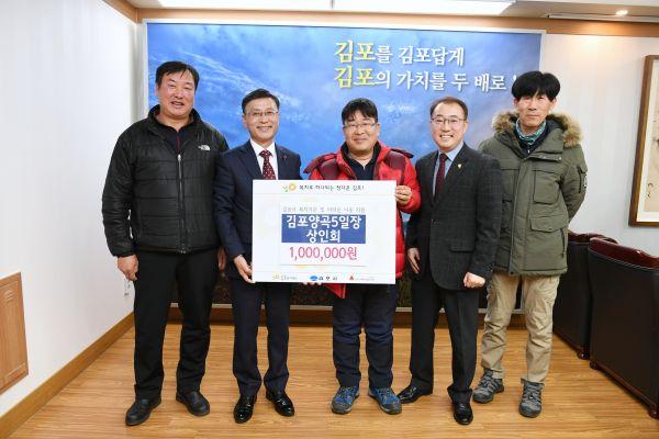 김포 양곡5일장 상인회장은 지난 19일 “상인회 회원들이 십시일반 모금한 성금 100백만원을 지역 내 어려운 이웃들에게 써 달라고 김포복지재단에 전달했다.