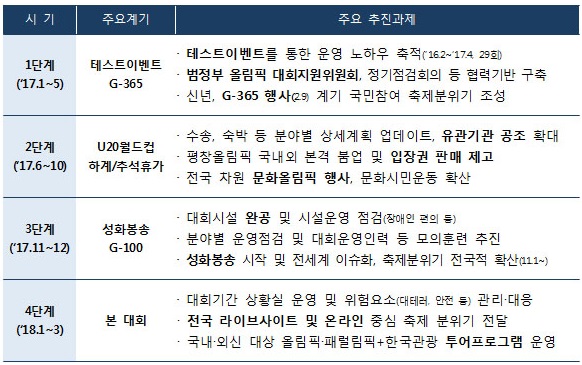 문체부는 평창올림픽을 전 국민이 즐길 수 있는 축제로 만들기 위해 개막 1년 앞인 G-365(2월9일), 성화봉송(11월1일~2018년 2월9일) 등 주요 계기별로 다양한 문화행사, 미디어 연계한 홍보를 강화한다.