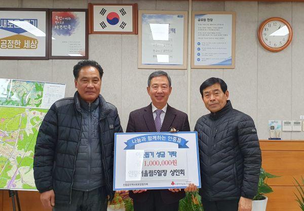 안중어울림 5일장 상인회가 지난 26일 평택시 안중읍행정복지센터를 방문해 관내 소외 이웃에게 도움이 되었으면 좋겠다며 이웃돕기 성금 100만원을 기탁했다.