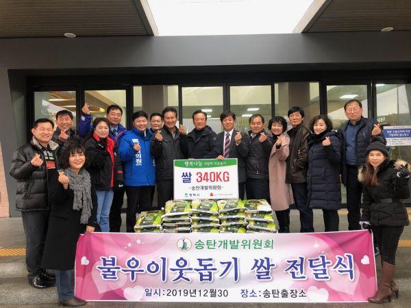 송탄개발위원회는 30일 연말을 맞아 어려운 이웃을 돕는 일에 써달라며 백미 10kg 34포를 송탄출장소에 기탁했다.