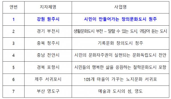 원주시는 2015년 문화체육관광부 공모사업에 선정돼 2016년부터 문화특화지역 조성사업을 추진해 왔으며 그 결과 지난해 문화도시 조성계획을 승인받았다.