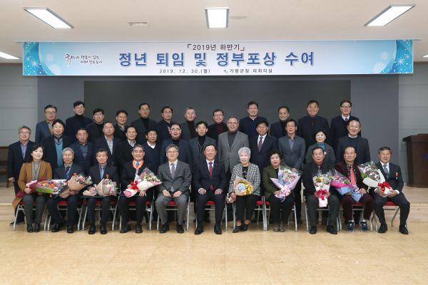 한편 종무식에 앞서 열린 올 하반기 정년 및 명예 퇴직자에 대한 정부포상에서는 전) 유근웅 경제복지국장이 홍조근정훈장을, 세정과장 임대원·복지정책과장 변애엽·안전재난과 신기철 등 3명이 녹조근정훈장을 수상했으며 보건소 신영숙 및 농업기술센터 이항재 등 2명이 옥조근정훈장 및 근정포장을 각각 받았다.