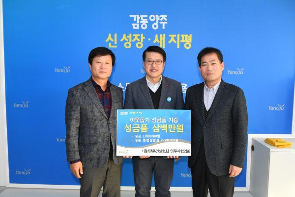 먼저 지난 27일에는 대한전문건설협회 양주시협의회가 양주시청을 방문해 성금 100만원과 200만원 상당의 상품권을 전달했다.