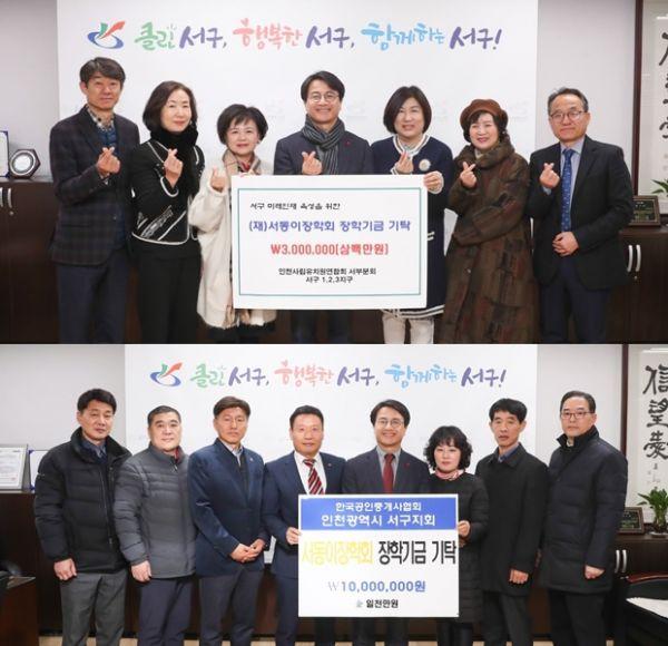 지난 30일 한국공인중개사협회 인천서구지회는 구청장실에 방문해 지역인재 육성을 위해 재단법인 서동이장학회에 1천만원의 장학금을 기탁했으며 인천사립유치원연합회 서부분회 1,2,3지구도 300만원의 장학금을 기탁했다.
