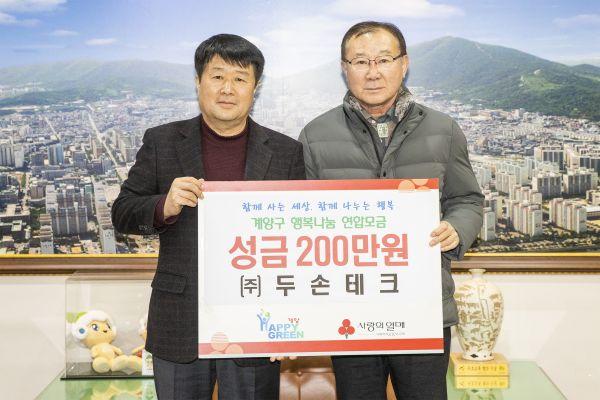 ㈜두손테크는 지난달 30일 ‘희망2020 따뜻한사랑나누기 캠페인’에 동참해 이웃돕기 성금 200만원을 계양구에 기탁했다.