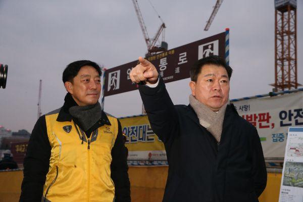 이른 새벽 영하의 추운 날씨에도 불구하고 철산주공7단지 공사현장을 찾은 박시장은 공사 관계자로부터 공사 현황을 청취 한 후 타워 크레인과 공사장 주변 휀스 등을 점검하고 안전보안관과 함께 학생과 시민들의 안전보행로 확보를 위한 안전지도사항을 점검했다.