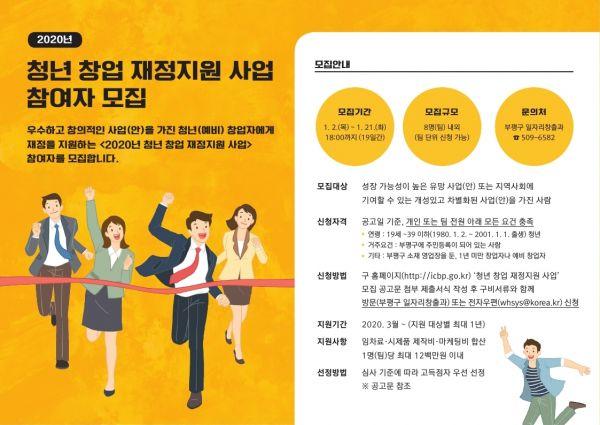 부평구가 오는 21일까지 청년 자립기반 강화를 위한 ‘청년창업 재정지원사업’ 참가자를 추가 모집한다.