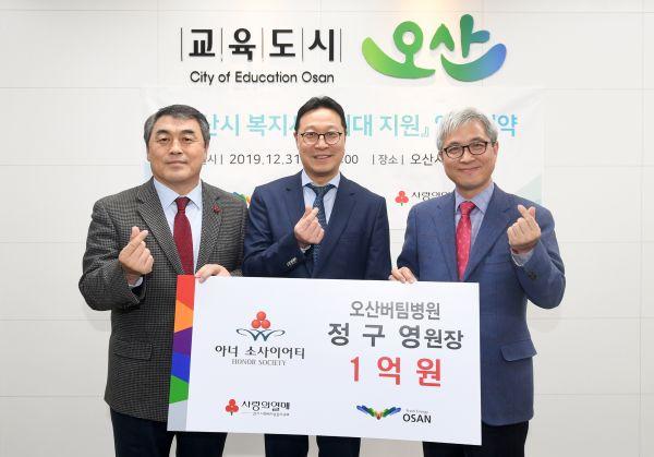 오산시는 지난 12월 31일 오산버팀병원과 경기사회복지공동모금회에 1억원 이상 고액기부자 모임인 아너 소사이어티 회원 가입식 및 희망찬 나눔문화 조성과 복지사각지대 지원 업무 제휴 협약식을 가졌다.