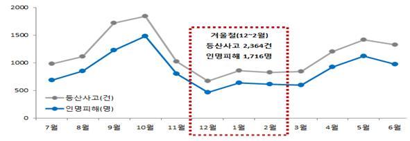 겨울철에는 2364건의 등산사고가 발생했으며 1716명이 다치거나 사망했다.