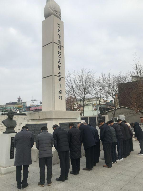 양주시 광적면은 지난 1일 광적면 가납리 소재 가래비 3.1운동 기념비 공원을 찾아 2020년 경자년 새해맞이 ‘양주 가래비 3.1운동 순국 기념비’ 참배 행사를 가졌다.