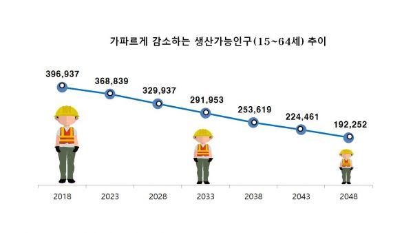 유소년 인구 100명 당 65세 이상 노년인구를 나타내는 노령화지수는 2018년 108명에서 2048년 752명으로 예측됐다.