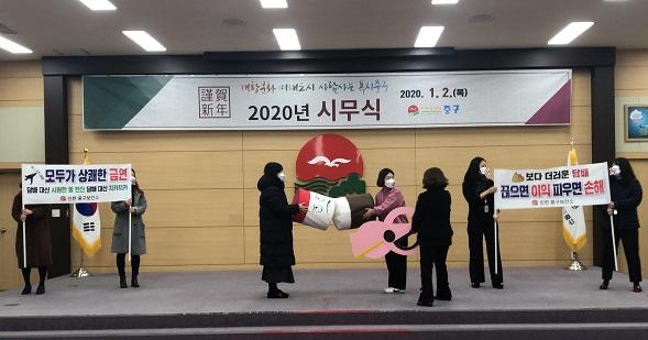 인천 중구는 지난 2일 홍인성 구청장과 직원 200여명이 참석한 가운데 금연다짐 퍼포먼스 등 이색 시무식을 개최했다.
