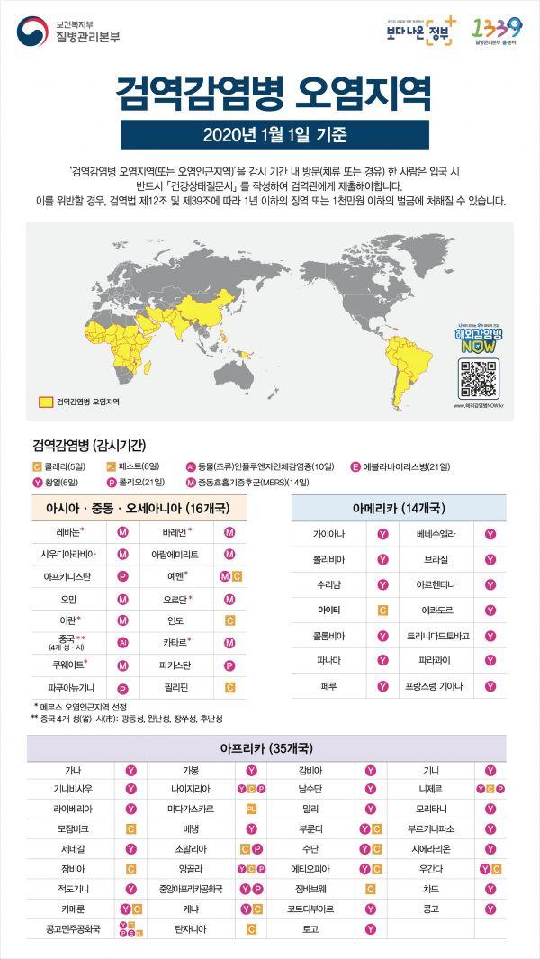 질병관리본부는 해외 검역감염병 국내 유입을 예방하기 위해 세계보건기구 의 감염병 발생 정보를 바탕으로 국내 감염병 전문가 검토를 거쳐 반기별로 검역감염병 오염지역을 지정해 관리하고 있으며 공항 및 항만 검역소는 검역감염병 발생지역 여행자를 대상으로 검역을 실시하고 필요시 검역감염병 진단검사와 보건교육 서비스를 제공하고 있다.