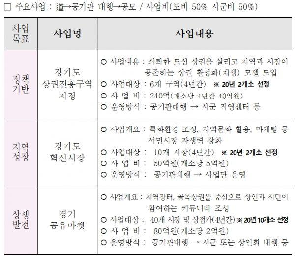 이 사업은 도내 6만 4천여명 전통시장 종사자를 비롯한 자영업자의 생업기반 강화와 구도심 상권 부흥 등을 목적으로 추진되며 경기도 상권진흥구역, 경기도 혁신시장, 경기공유마켓 3종으로 구성됐다.