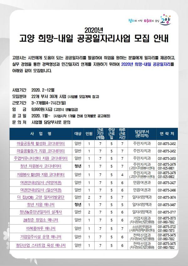 고양시 일자리정책과 관계자는 “‘고양 희망-내일 공공일자리’는 말 그대로 참여자에게 ‘희망이 있는 내일’을 만들기 위해 고양시가 계획한 생활밀착형 공공일자리 사업으로서 한시적 일자리가 아닌 민간과 연계한 지속가능한 일자리 사업으로 거듭날 것”이라며 “많은 시민의 관심과 참여를 바란다”고 말했다.