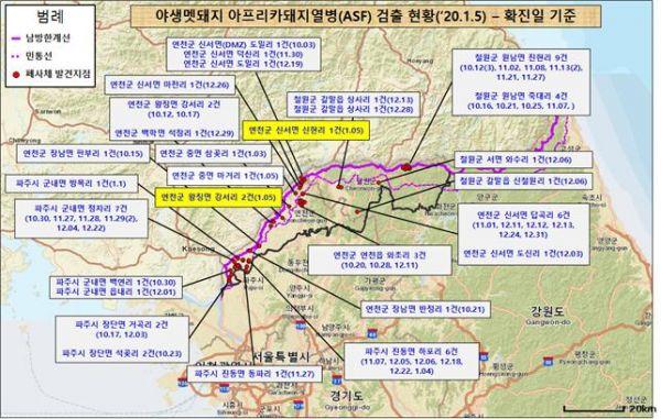 환경부 소속 국립환경과학원은 1월 4일 경기도 연천군 민통선 안에서 발견된 3개체의 멧돼지 폐사체에서 아프리카돼지열병 바이러스가 검출됐다고 6일 밝혔다.