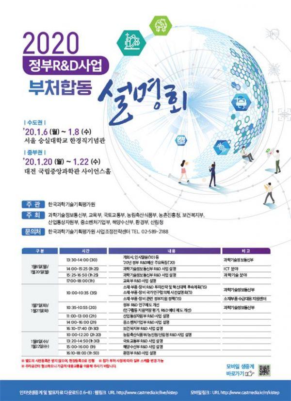 과학기술정보통신부는 산업통상자원부, 중소벤처기업부 등 연구개발 사업을 수행하는 10개 중앙행정기관과 합동으로 2020년도 정부연구개발사업 부처합동설명회를 6일부터 오는 22일까지 2개 권역에서 개최한다.