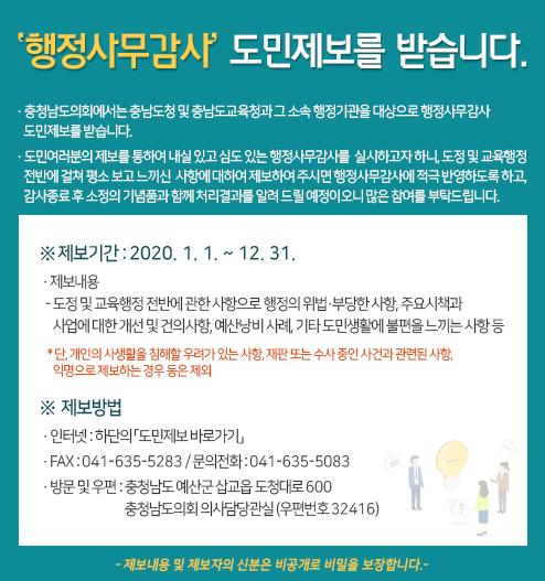 충남도의회는 올해도 행정사무감사 도민제보 기간을 연중 운영한다고 6일 밝혔다.