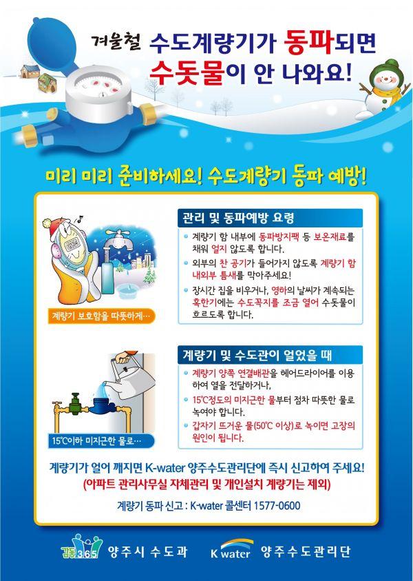 만약 계량기나 수도관이 얼었을 때는 계량기 양쪽 연결배관을 헤어드라이어를 이용하거나 미지근한 물부터 따뜻한 물로 서서히 녹여줘야 하며 계량기가 동파되면 K-water 양주수도관리단에 신고해야 한다.
