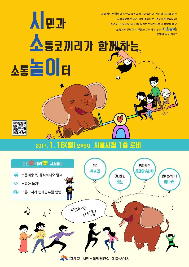 오는 16일 오후 5시 시흥시청 로비에서 개최하는 ‘시민과 함께하는 소통놀이터’(이하 시소놀이)는 소통코끼리 임명식과 함께 ‘소통코끼리송(song)’을 발표하고, 시민과 함께하는 게임, 포스트잇 토크 등 다채로운 코너와 여러 인디밴드의 공연으로 구성되었다. 이날 행사에서 시민소통코끼리와 시 매체 구독자 등을 초대하여 그간의 소통노력을 공유하는 시간을 가질 계획이다.