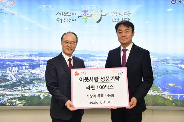 사랑과 희망 나눔회가 하남시에 190만원 상당의 라면 100박스를 기탁했다.