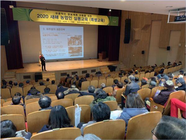 파주시는 지난 7일 문산읍행정복지센터 대공연장에서 관내·외 농업인, 귀농·귀촌인 등 200명을 대상으로 ‘지역농업·농촌 발전방향’이란 주제로 2020 새해농업인실용교육의 첫 번째 교육을 실시했다.