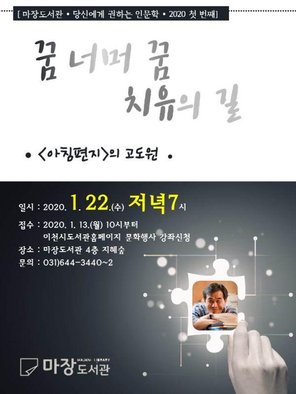 꿈, 희망, 힐링의 시간을 전해줄 고도원 작가의 강연은 오는 1월 22일 수요일 저녁 7시 마장도서관에서 진행되며 1월 13일 월요일 오전 10시부터 이천시 통합도서관 홈페이지에서 선착순으로 모집할 예정이다.