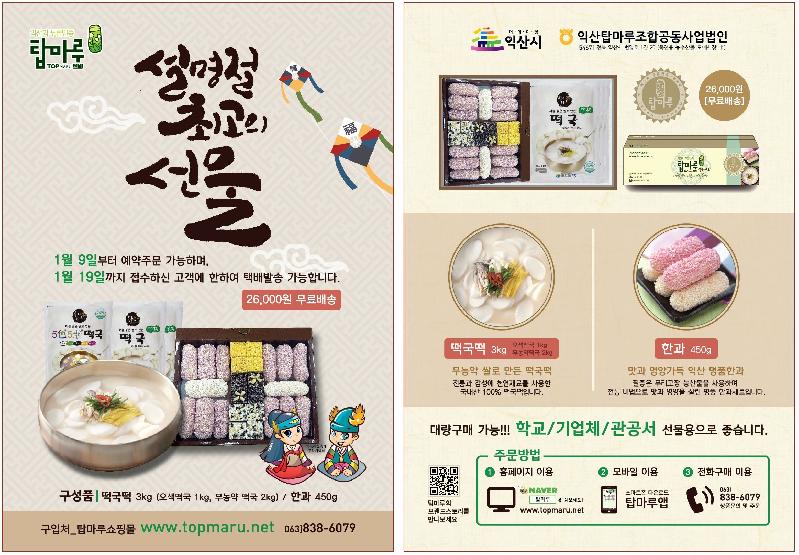 주문은 탑마루 쇼핑몰(www.topmaru.net)과 스마트폰 쇼핑몰(탑마루앱 다운로드), 주문전화(☎838-6079)를 통해 오는 1월 19일까지 할 수 있다.