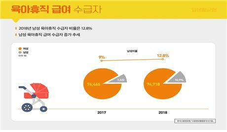 ’18년 남성 육아휴직 수급자 비율은 12.8%로 2017년 9%에서 1년 사이에 3.8%p 증가했다.