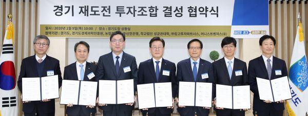 이재명 지사는 9일 오전 경기도청 상황실에서 이대훈 농협은행 은행장, 진옥동 신한은행 은행장, 이태협 성균관대 상임이사, 김창수 ㈜킹고투자파트너스 대표, 이승흠 어니스트벤처스 대표, 김기준 경기도경제과학진흥원장과 함께 이 같은 내용의 ‘재도전 투자조합 결성 협약’을 체결했다.