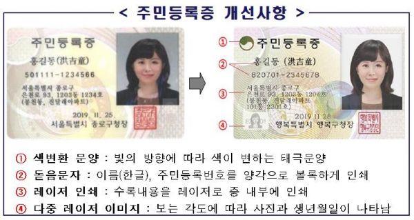 이에 따라 새해부터는 위·변조를 방지하는 보완성이 한층 강화된 주민등록증을 받을 수 있게 되며 주민등록증 재질 또한 내구성이 강한 폴리카보네이트로 바뀌었다.