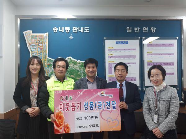 동두천시 소재 ㈜삼백건설 추철호 대표는 지난 9일 소외된 이웃을 돕는 일에 사용해달라며 송내동 행정복지센터에 이웃돕기 성금 100만원을 기탁해 훈훈한 온정을 선사했다.