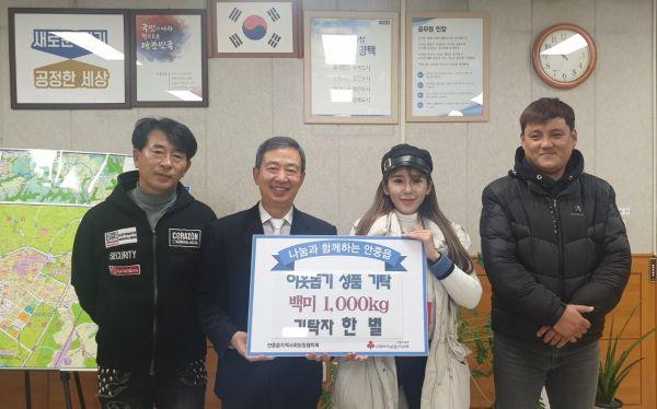 1인 크리에이터 한별씨가 지난 9일 안중읍행정복지센터를 방문, 관내 독거노인을 위한 ‘백미 100포’를 전달했다.