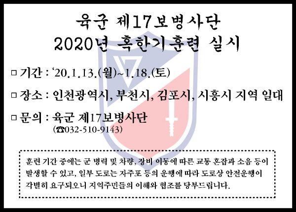 육군 제17보병사단이 오는 13일부터 18일 김포시 전 지역에서 ‘2020년 정기 혹한기 훈련’을 실시한다.
