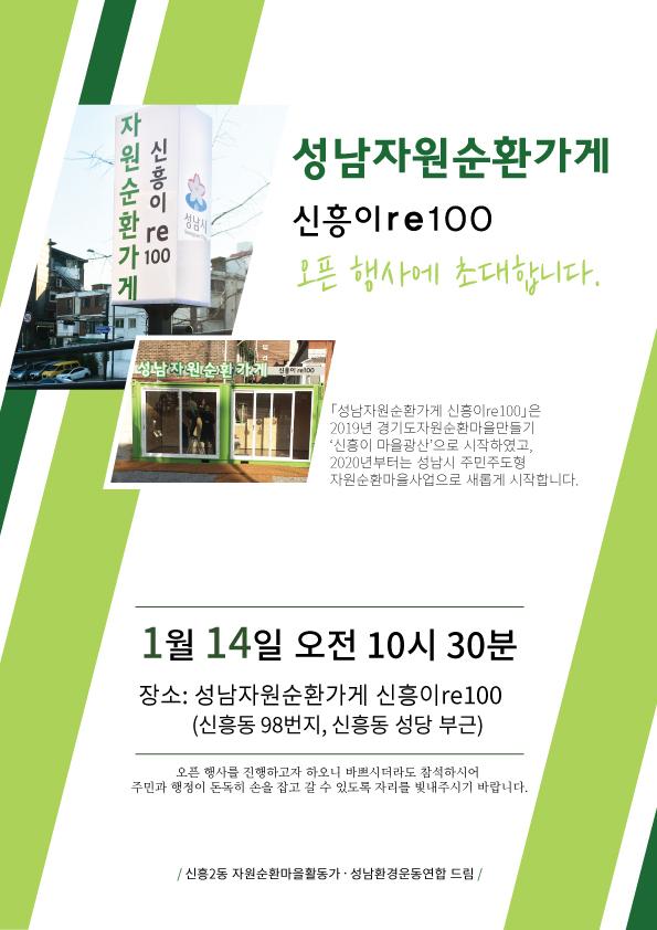 ‘성남 자원순환가게 신흥이 re100’은 성남시, 성남환경운동연합, 민간기업의 참여로 배출된 재활용품을 주민들에게 직접적인현금이나 성남모바일사랑상품권으로 보상을 해주는 국내에서 최초로시도되는 시범사업이며 유가보상 방법은 시범사업 기간동안 현금으로지급을 했고 앞으로 성남모바일사랑상품권으로 지급될 예정이어서 관내지역 상권을 살리는데 도움을 줄 전망이다.