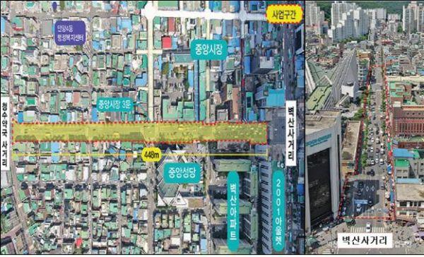 장내로 개선구간은 벽산사거리부터 청수약국 앞에 까지 450m다.